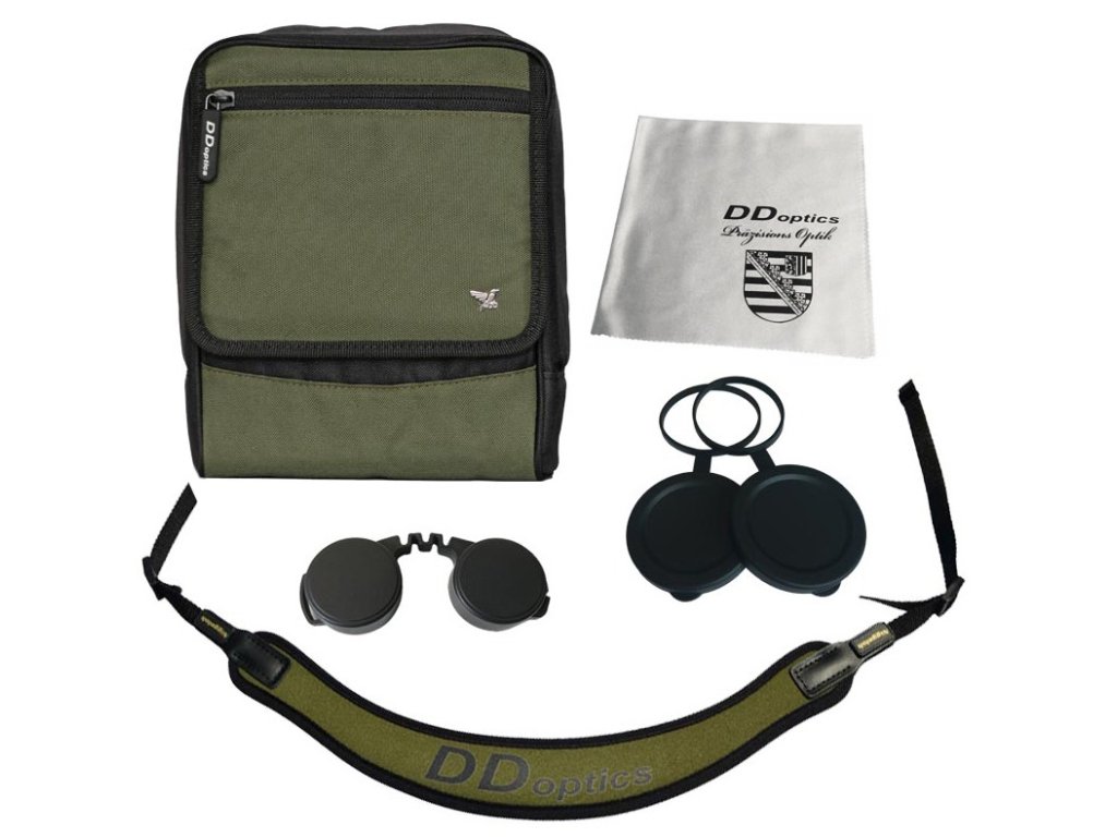 Obsah balenia: Popruh na prenášanie od Niggeloh, puzdro na ďalekohľad, krytky objektívov a okulárov, čistiaca handrička.