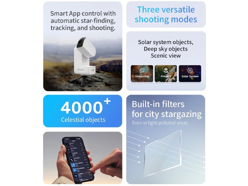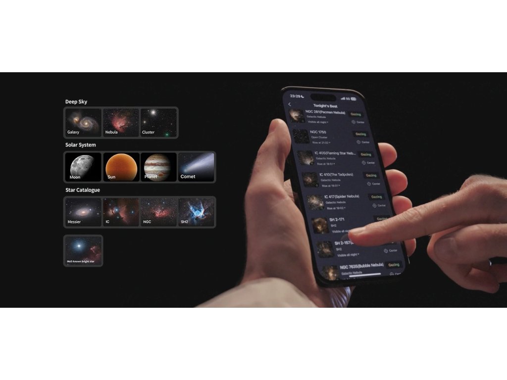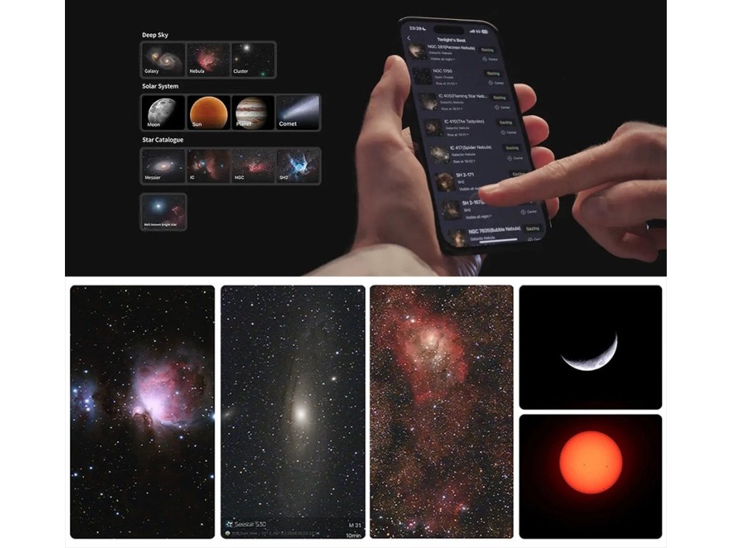 - Aplikácia Seestar umožňuje jednoduché prepojenie, automatické zarovnanie, výber z viac ako 4 000 objektov pomocou mapy nočnej oblohy, živé skladanie snímok (stacking), time-lapse, videá a štatistiky