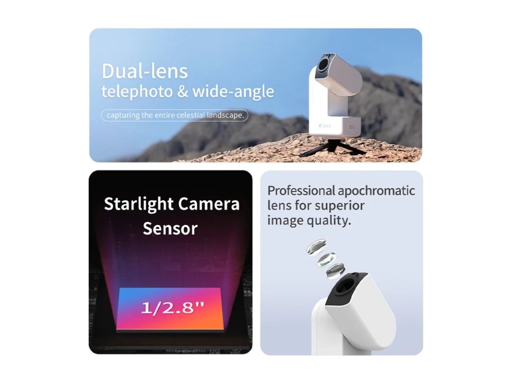 - Obsahuje teleobjektív (APO triplet) pre detailné nočné snímky a širokouhlý objektív pre krajinu, jednoduché nájdenie objektu a prechod medzi formátmi záberu