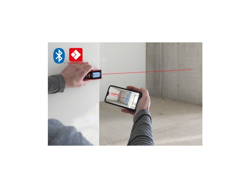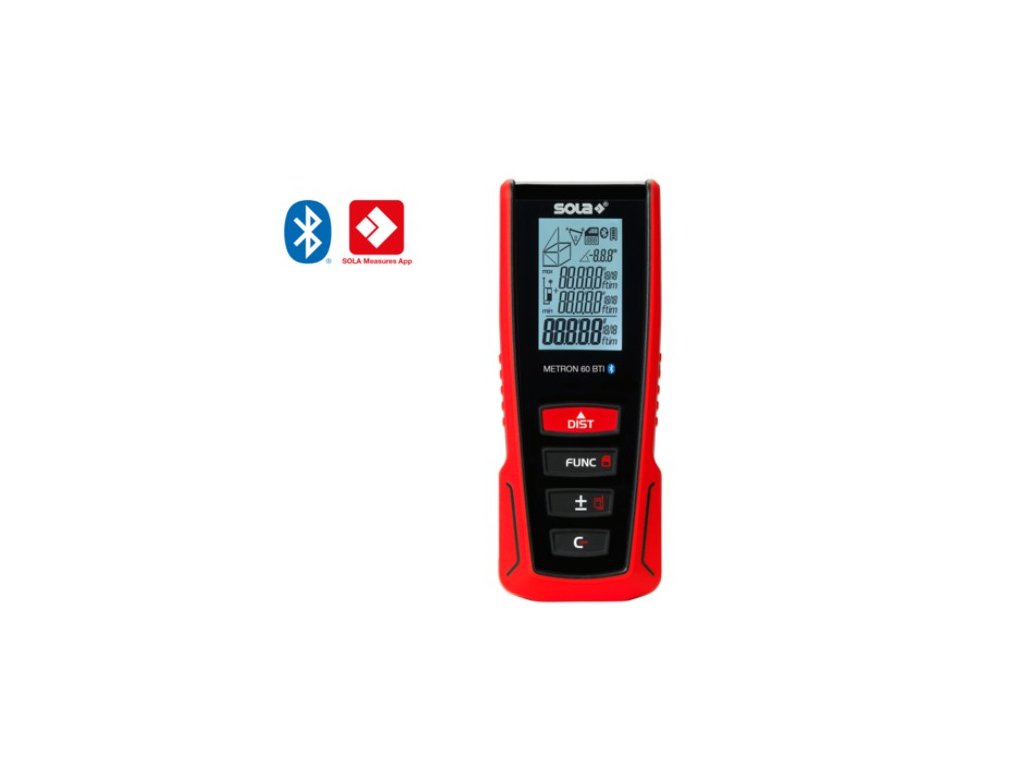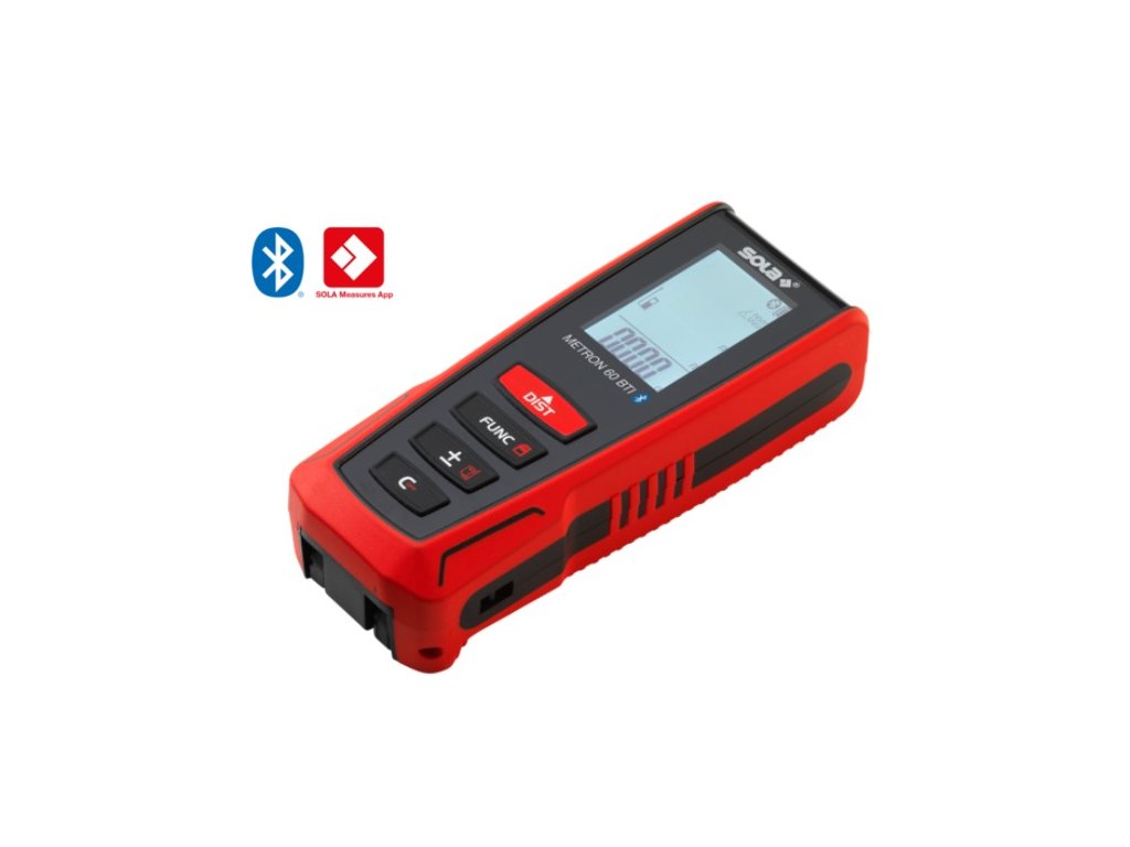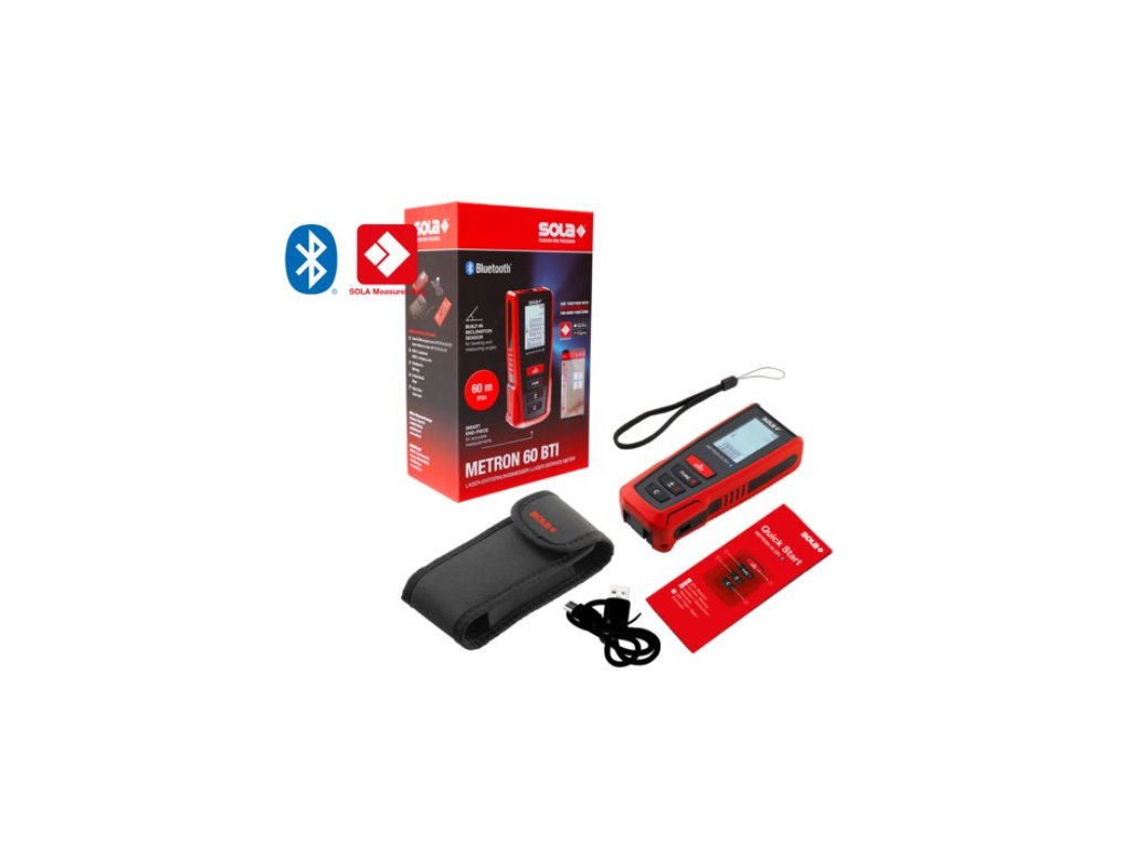 Laserový diaľkomer SOLA METRON 60 BTI má dosah 60 m s presnosťou ± 1,50 mm. Diaľkomer je vybavený rozhraním Bluetooth, vďaka čomu je možné prenášať namerané hodnoty prostredníctvom aplikácie SOLA Measures priamo do smartfónu.