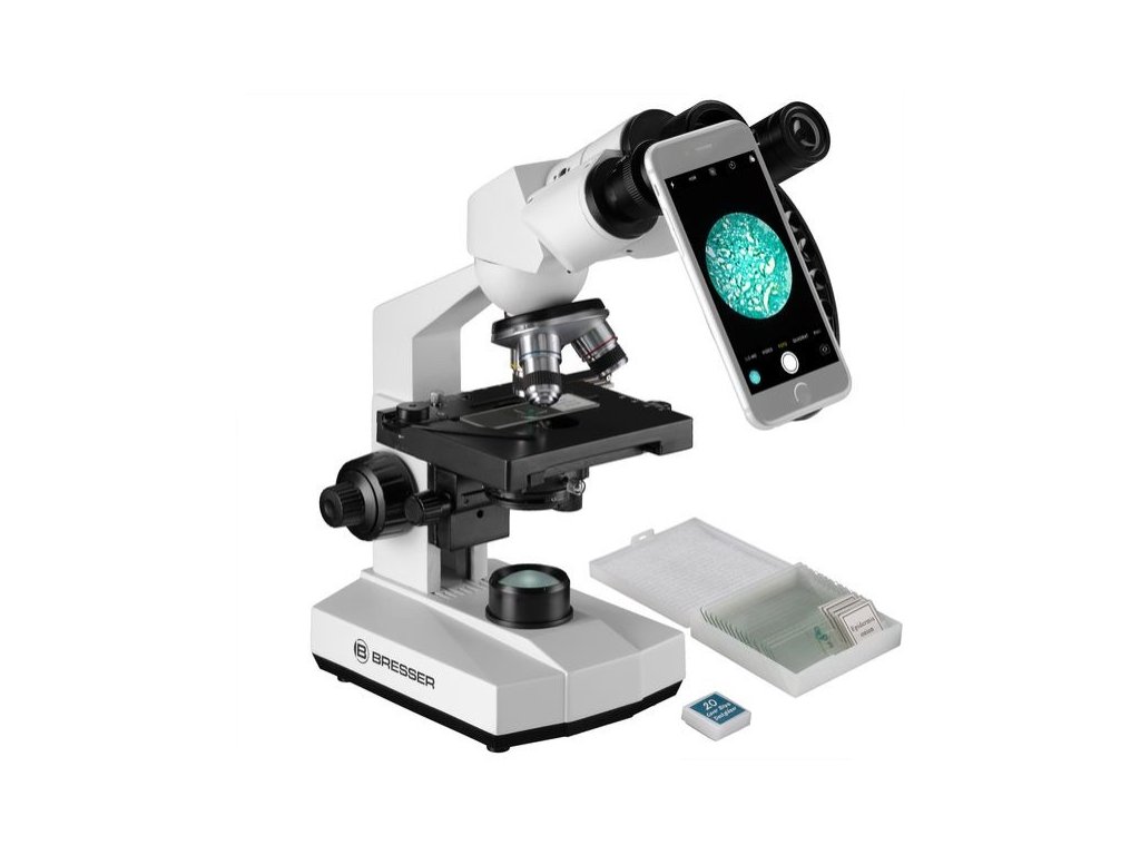 Mikroskop v kufríku s achromatickými objektívmi DIN 4x/10x/40x, širokouhlé okuláre WF10x, Abbe kondenzor s apertúrnou clonou, fotoadaptér na mobil, hotové preparáty, čisté podložné a krycie sklíčká, plastový kufrík