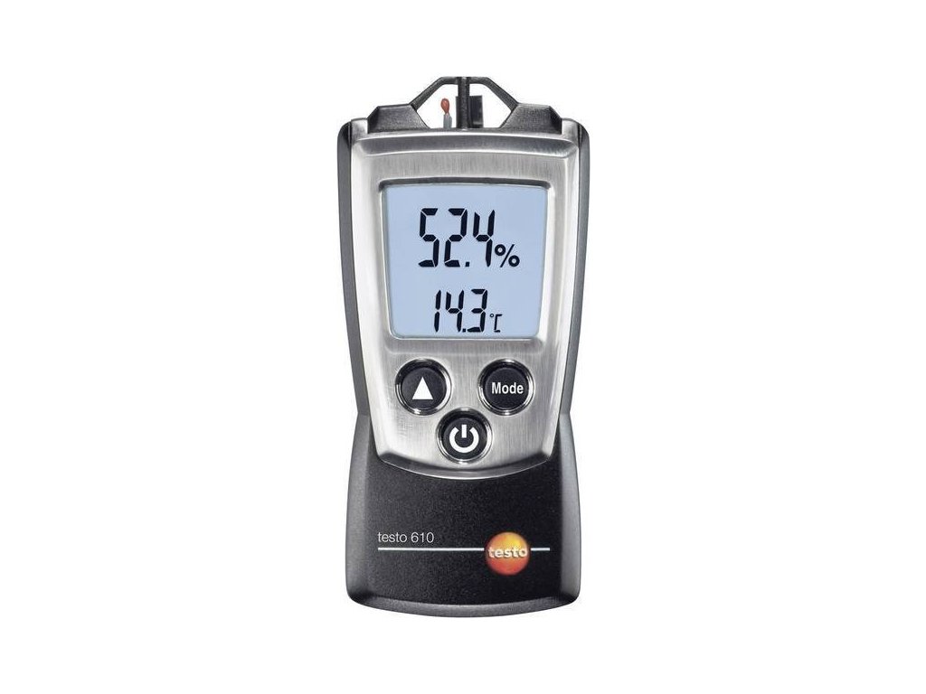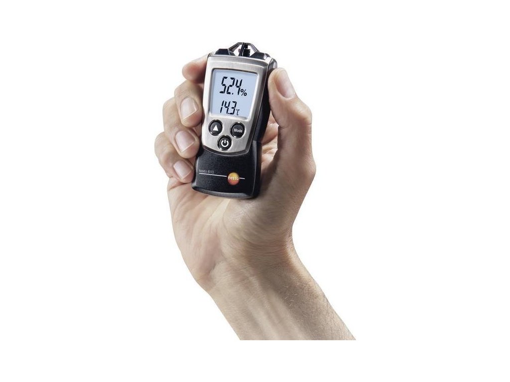 Testo 610 meria relatívnu vlhkosť a teplotu vzduchu. Určenie rosného bodu a Wetbulb (mokrého teplomeru). Ďalšími funkciami sú funkcie Hold a zobrazenie max - min hodnoty.